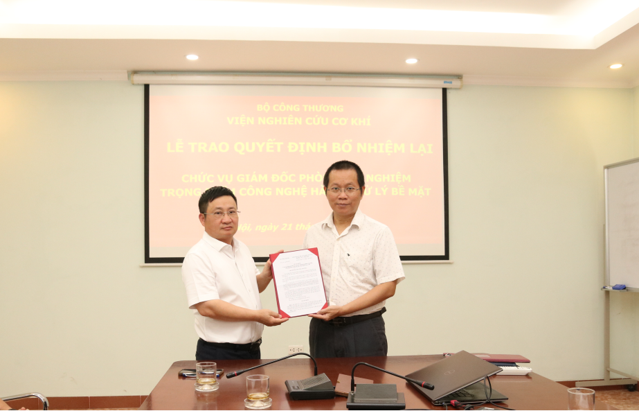 Ngày 21/7/2025, thừa ủy quyền của Bộ Công Thương, thay mặt Đảng ủy Viện, tập thể Lãnh đạo Viện, ông Phan Đăng Phong, Bí thư Đảng ủy, Viện trưởng đã trao Quyết định bổ nhiệm lại chức vụ Kế toán trưởng đối với ông Hoàng Văn Hùng theo Quyết định của Bộ trưởng Bộ Công Thương đã ký ngày 08/7/2025 và Quyết định bổ nhiệm lại chức vụ Giám đốc Phòng Thí nghiệm trọng điểm Công nghệ Hàn và Xử lý bề mặt đối với ông Lê Thu Quý theo Quyết định của Bộ trưởng Bộ Công Thương đã ký ngày 14/7/2025.