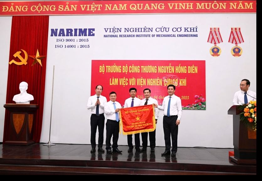 Nhân dịp này, Bộ trưởng Nguyễn Hồng Diên đã trao cờ thi đua của Bộ Công Thương cho Viện Nghiên cứu Cơ khí vì đã có thành tích tiêu biểu, xuất sắc trong các phong trào thi đua, góp phần vào sự nghiệp xây dựng và phát triển ngành Công Thương Việt Nam năm 2024. Ảnh: Cấn Dũng
